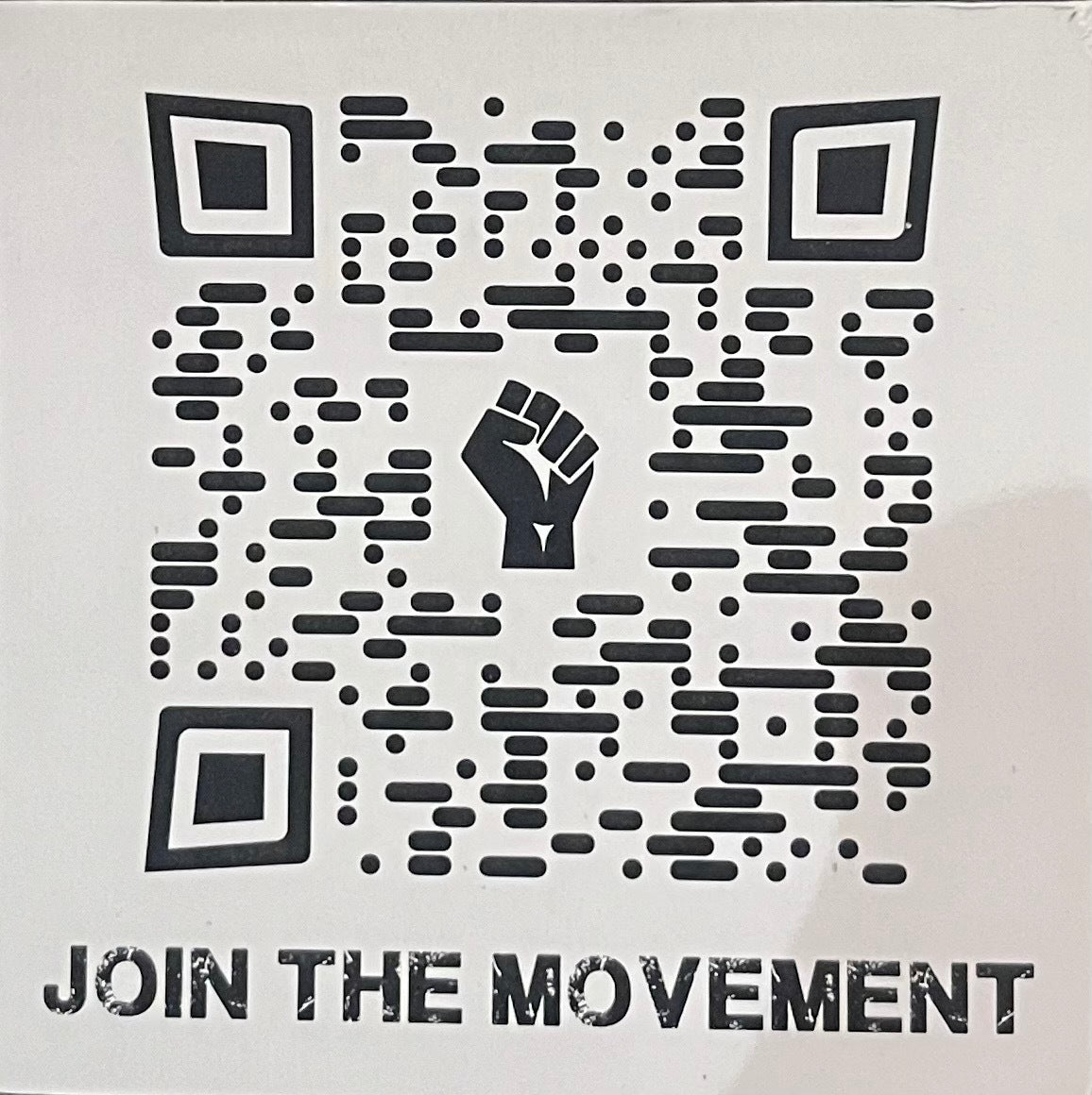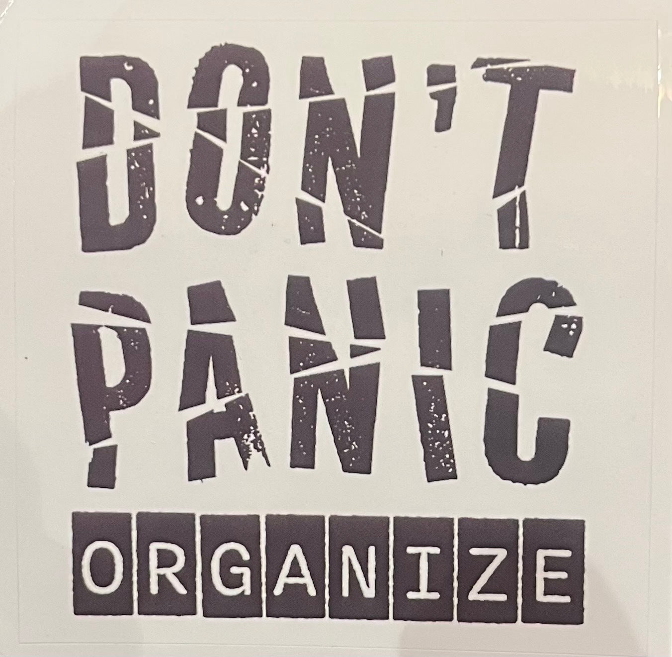 Don't Panic. Organize! And encourage others to organize with you by following the QR code on the back of this sticker to join our Slack Workspace. Together, let's build the beloved community.